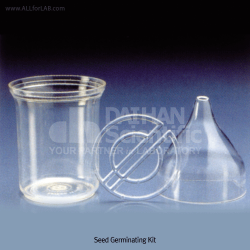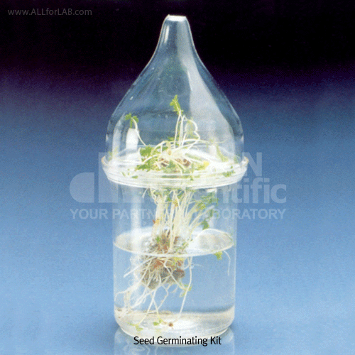 Complete 3-piece kit for checking seed germination. A strip of filter paper is inserted through the slot in the annular support, a circular sheet of filter paper is placed on the support, and seeds are laid out on this sheet of filter paper. Includes a top bell equipped with an air vent. Confirms to DBGM1671453.